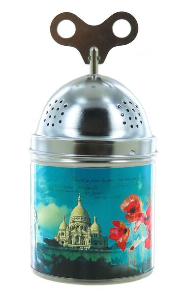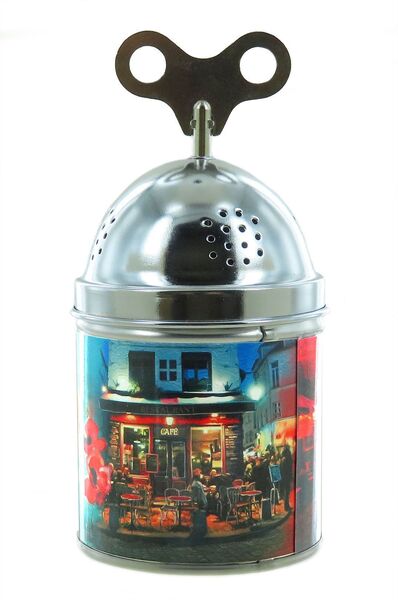 Spieluhr aus Metall mit großem Aufziehknopf oben.
