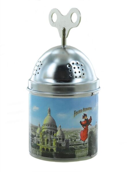 Spieluhr aus Metall mit großem Aufziehknopf oben.