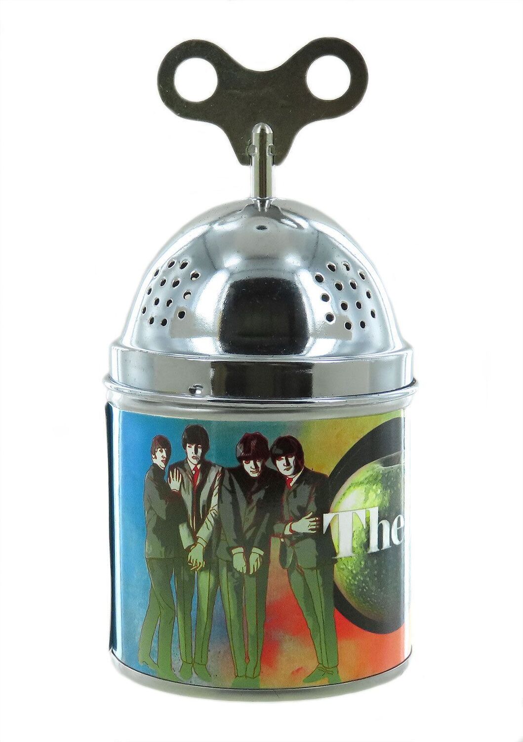 Spieluhr aus Metall mit großem Aufziehknopf oben.