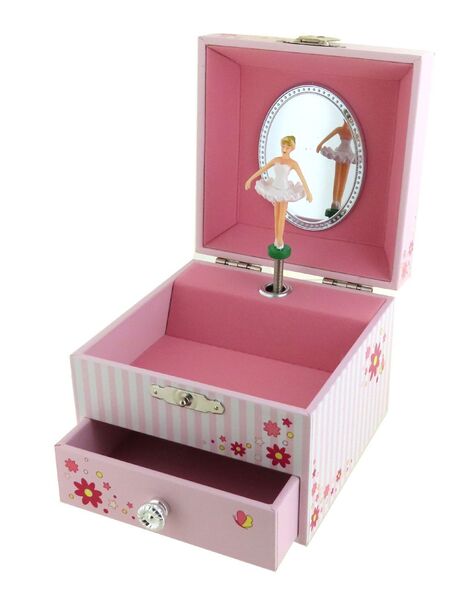 Maße dieser Schmuckschatulle und Spieluhr mit tanzender Ballerina: 12 X 10,5 X 8,5 cm.