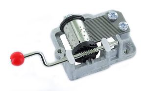 This is an 18-note hand crank music box made of cardboard with a transparent windowpane made of PVC.