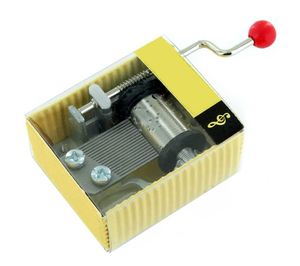 This is an 18-note hand crank music box made of cardboard with a transparent windowpane made of PVC.
