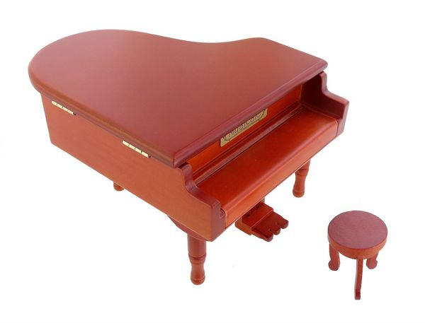 Instrument de musique miniature et boîte à musique en bois en forme de piano à queue avec son tabouret.