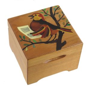 Boîte à musique en bois massif (noyer, érable, cerisier, poirier...) avec marqueterie traditionnelle: oiseau chanteur sur une branche.