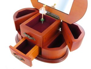 Boîte à bijoux musicale en bois avec ballerine dansante, un tiroir (deux dont un faux tiroir), 4 cases pour ranger bagues et autres bijoux et un grand miroir.