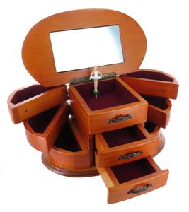 Boîte à bijoux musicale en bois avec ballerine dansante, deux tiroirs, un miroir et 6 compartiments pour bagues et bijoux.