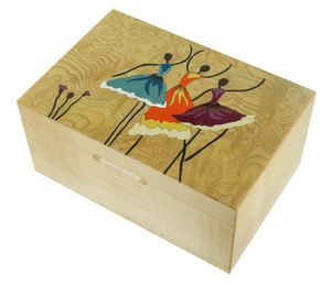 Boîte à bijoux musicale en bois (finition mate) avec ballerine dansante en résine et tissu (satin), grand miroir et véritable marqueterie traditionnelle "3 ballerines" sur le couvercle.