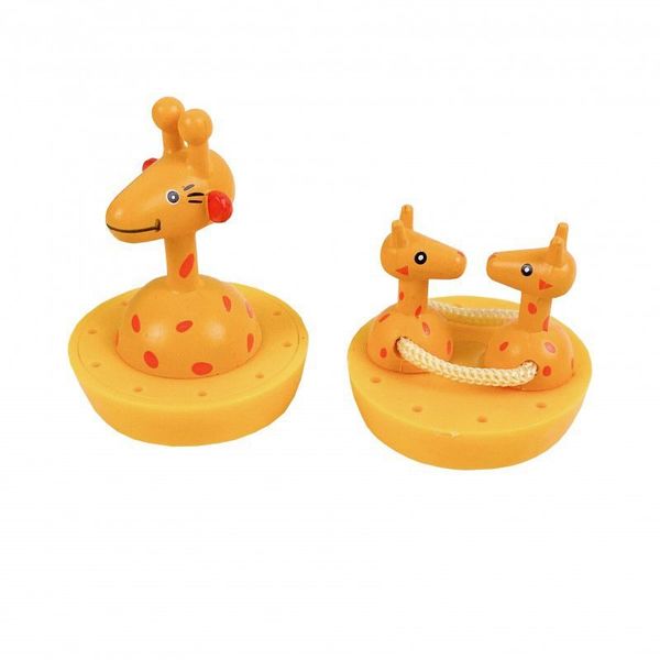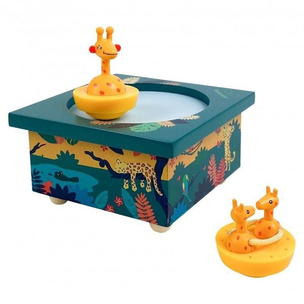 Les deux Sophie la girafe de cette boîte à musique Trousselier tournent sur elles-mêmes et se déplacent pendant que la mélodie se fait entendre.