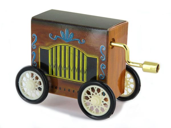 Boîte à musique à manivelle en carton, résine et métal en forme d'orgue de barbarie avec roues tournantes et mécanisme musical traditionnel de 18 notes.