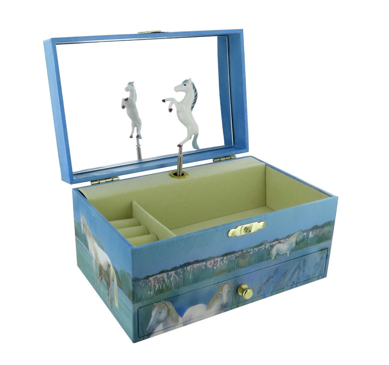Boîte à musique / boîte à bijoux musicale Trousselier en bois recouvert de papier décoré (chevaux de Camargue).