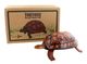 Après avoir remonté le mécanisme à ressort de ce jouet mécanique en métal avec une clef, la tortue se met à marcher en bougeant les pattes, sa tête et sa queue.