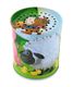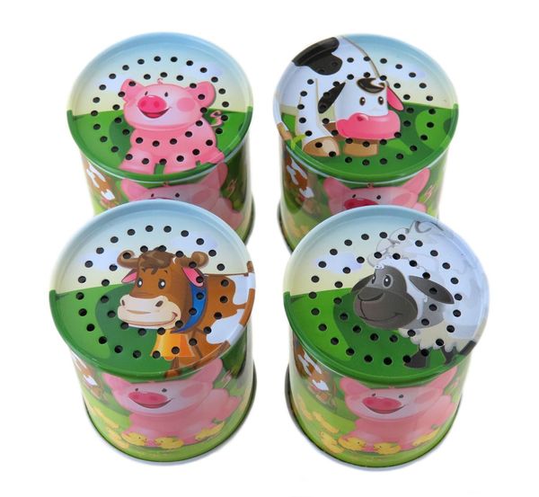 Cylindrique, cette boîte à meuh ou boîte à vache est décorée sur le dessus d´une vache marron (il existe en tout 4 dessus différents: vache blanche et noire, vache marron, cochon et mouton) et sur le pourtour les animaux suivants sont mis en scène: vache noire et blanche, cochon et mouton.