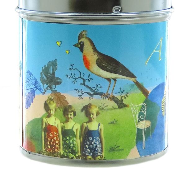 Boîte à musique en métal illustré avec grande clef de remontage supérieure.
