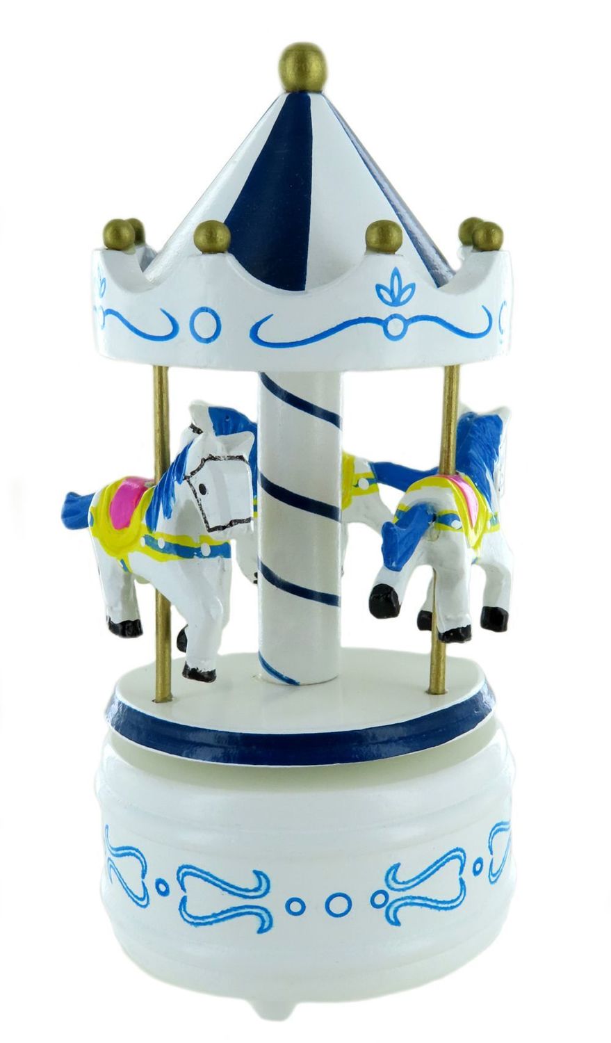 Carrousel musical miniature en bois entièrement peint à la main. Les chevaux du carrousel musical miniature tournent au son de la mélodie après remontage du chapiteau.