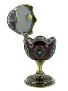 Oeuf musical en métal de style Fabergé avec dorures et strass et intérieur tapissé d'un tissu gris.