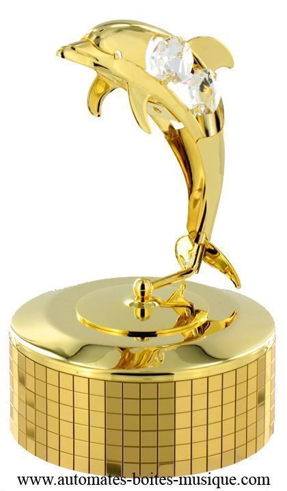 Il delfino di metallo dorato e cristallo Swarovski gira al ritmo della melodia.
