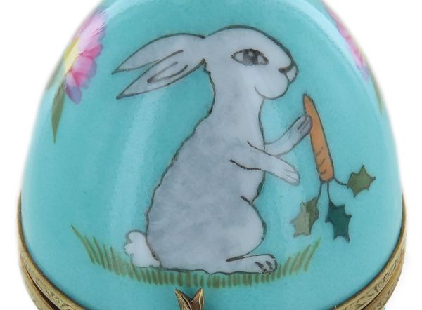 Uovo musicale di tipo Fabergé made in France con coniglio di porcellana.