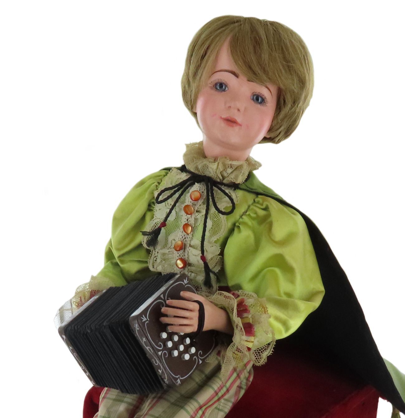 Este autómato musical mantém o seu traje original (camisa de cetim com rendas e calças às riscas). O autómato está sentado num banco com pés dourados, revestido a veludo vermelho, com corda na parte de trás.