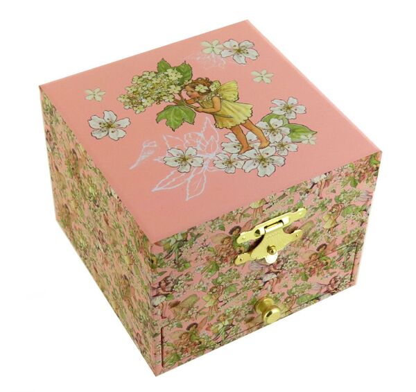Após acionar o mecanismo musical e abrir a tampa, uma fada aparece e começa a girar ao som da melodia.