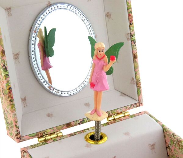 Após acionar o mecanismo musical e abrir a tampa, uma fada aparece e começa a girar ao som da melodia.