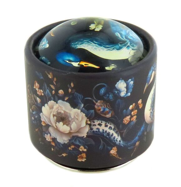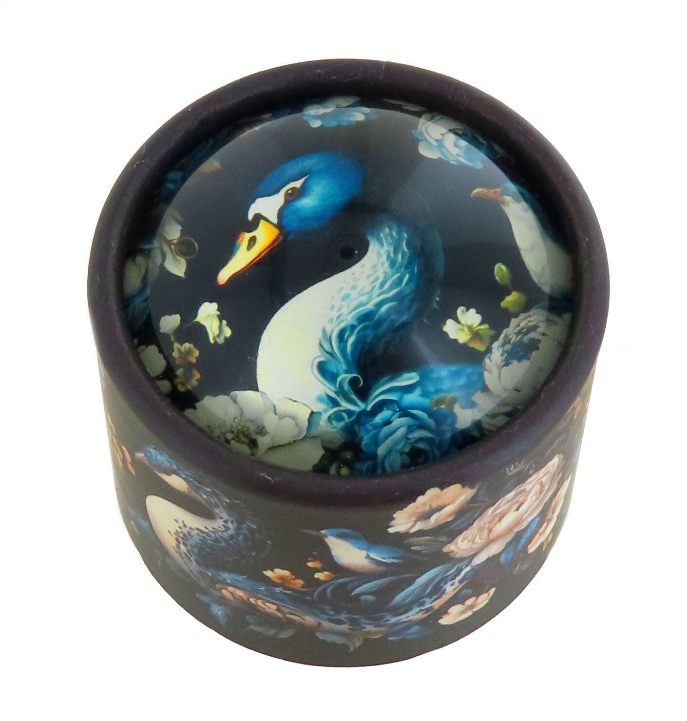 Caja de música animada de cartón ilustrado con una media esfera de cristal que contiene un dibujo de vivos colores que produce un efecto mágico.